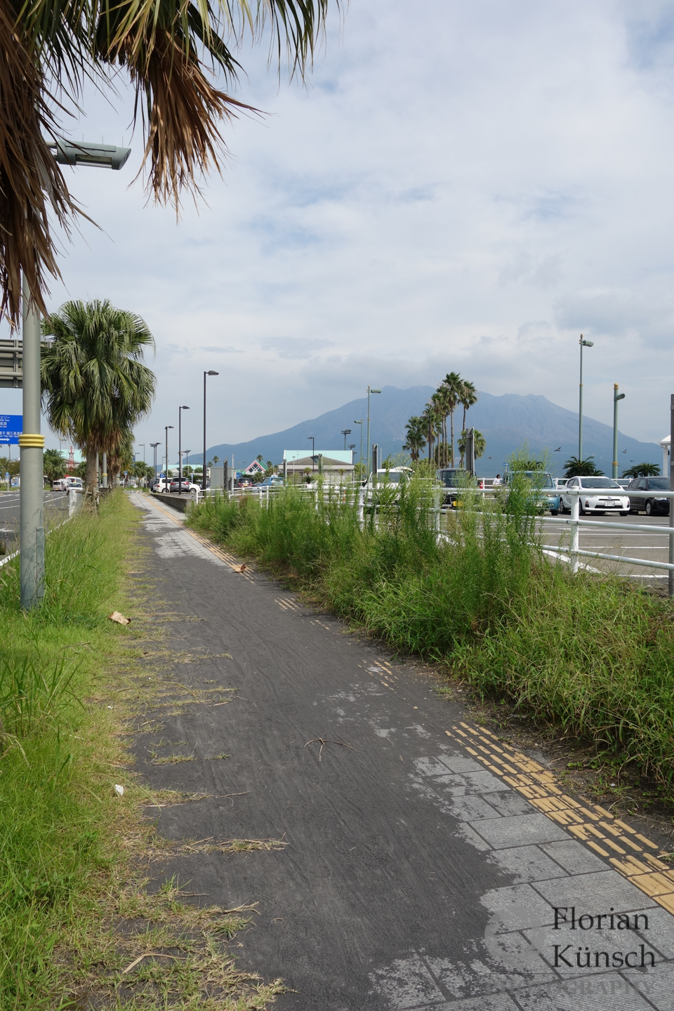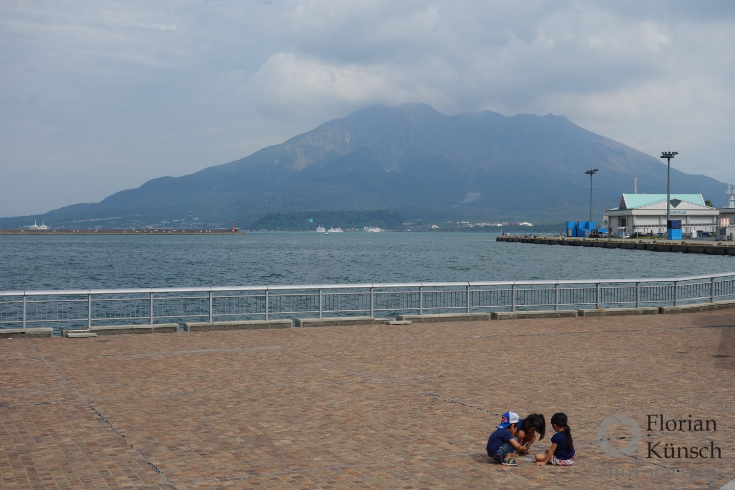 Das Wahrzeichen von Kagoshima ist der Vulkan Sakurajima. Er liegt direkt gegenüber der Stadt Kagoshima auf einer Insel. Durch das Meer und die Distanz ist die Stadt einigermassen vom aktivsten Vulkan in Japan geschützt. Leider ist das Glück diesmal nicht auf unserer Seite und wir sehen nicht, wie er raucht. Was wir aber sehen, sind Sammelstellen für die Asche, welche überall in der Stadt verteilt sind.