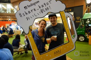 Schon als wir in Kagoschima angekommen sind, sehen wir, dass am Bahnhof mehrer Stände und Festbänke aufgebaut sind und ein grosses Plakat weist auf ein Bierfest hin. Am Abend gehen wir nochmals zum Bahnhof und tatsächlich: Ein Bierfest mit Mikrobrauereien aus Kyūshū. Wir bleiben eine Weile dort, trinken ein zwei Biere und geniessen die Atmosphäre. Ganz japanisch machen wir dann noch ein Foto mit einem grossen Bierplakat (Randbemerkung: Überall in Japan gibt es in Grossformate irgendwelche Gegenstände, mit welchen man sich ablichten kann. Die Japaner scheinen dies zu lieben) und werden natürlich die ganze Zeit von allen beobachtet. Denn in Kagoshima scheinen wir momentan ziemlich die einzigen europäischen Touristen zu sein, ob dies immer so ist, wissen wir nicht.