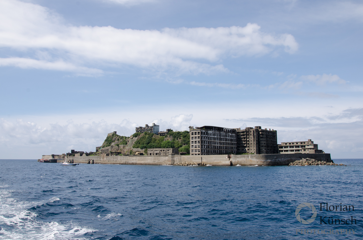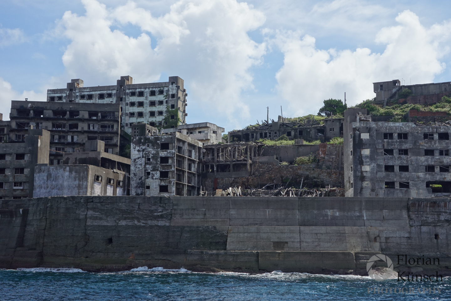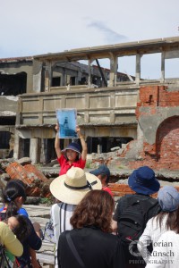 Wir waren also glücklich, zwei Plätze bekommen zu haben und besuchen die Insel mit der Morgentour. Als wir am Ablegeort ankommen, sind wir erneut die einzigen europäischen Touristen und fragen uns schon, ob es wirklich einen englischen Guide gibt. Zum Glück habe sie einen Audioguide auf Englisch, welchen wir gratis bekommen. Denn auf dem ganzen Ausflug wird die Geschichte nur auf Japanisch erklärt. Leider vergessen sie teilweise die Audioaufnahme auf Englisch zu starten und somit bekommen wir nur die Hälfte des Erzählten mit. Trotzdem war es ein sehr interessanter Ausflug. Leider konnte man nicht durch die Ruinen schlendern und musste sich mit einem vorgefertigten und kurzen Weg für Touristen begnügen.