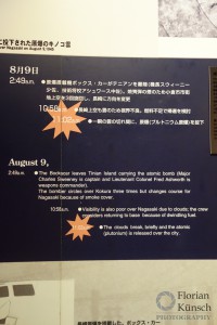 Auf einer Zeitachse werden die Ereignisse aufgelistet (von der Auswahl der Städte bis zum Abwurf), welche dazu führten, dass auf Nagasaki eine Atombombe abgeworfen worden ist. Sehr erschreckend ist der letzte Punkt. Denn es wird einem bewusst, nur wenige Minuten waren entscheidend… Dem Flugzeug ging langsam das Benzin aus und über der Stadt Nagasaki waren noch Wolken. Die Crew erwägte, ob sie nicht zurück fliegen soll. Leider öffnete sich vier Minuten später die Wolken und die Atombombe wurde trotzdem abgeworfen…