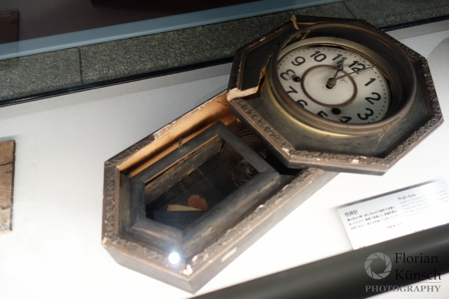 Das Museum zeigt teilweise brutale Bilder der Folgen des Abwurfs und was die Bewohner erlebt haben. So befinden sich im Museum allerhand Gegenstände aus verschiedenen Radien rund um die Explosion, welche diesen Moment festgehalten habe. So sieht man zum Beispiel ein durch die Hitze der Explosion geschmolzene Glasflasche mit den Knochen eines Opfers oder einen steinharten Lehmklumpen, welcher das Einzige war, was ein Vater von seinen Kindern fand. Auch findet man eine Uhr, welche bei der Explosion zerstört worden und genau dann stehen geblieben ist (11:02 Uhr):
