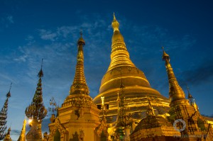 Zu der beeindruckendsten Sehenswürdigkeit gehört die Shwedagon Pagode, das Wahrzeichen und religiöse Zentrum Myanmars. Kurz vor Sonnenuntergang treten wir über einen der vier Eingänge auf den Hauptplatz. Zu Beginn sprechen uns in nur kurzen Abständen drei verschiedene Personen an, beginnen ein Gespräch, fragen, von wo wir sind und auf die Antwort Schweiz, wissen sie sofort das in diesem Land vier Sprachen gesprochen werden. Nun ja, das zu erst sehr freundlich und die direkte Art stellt sich schnell als Kundensuche für eine Tour heraus. Wir verneinen, möchten wir heute einfach die Stimmung auf uns wirken lassen. Es wimmelt von Touristen und Tourguides, aber auch scheint es ein Ort der Begegnung und der Geselligkeit zu sein. Wir sehen die Leute beten aber auch zusammensitzen und plaudern. Wir finden dies sehr angenehm, machen uns in Uhrzeigersinn auf den Weg um die Pagode, in welcher 7 Buddha-Haare bewahrt seien sollen.