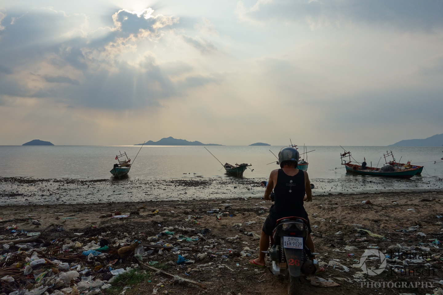 Während wir die Eindrücke auf uns wirken lassen und die gemütlich ruhige Stimmung geniessen, denken wir über unsere Reise in Kambodscha nach. Ein Land, auf der einen Seite mit einer grausamen Vergangenheit, die noch nicht lange zurück ist, und auf der anderen Seite, Menschen, die Gelassenheit und Freundlichkeit ausstrahlen. In den verschiedenen Städten haben wir oft die grossen Unterschiede zwischen Arm und Reich gesehen, der Anfang von verbesserten Infrastrukturen, ausländische Investoren, NGOs,… Ich nehme an, dass es einen grösseren Zuwachs in den einst sehr verlassenen Städten gegeben hat, die jungen Leute auf bessere Chancen in den Städten hoffen und vielleicht teilweise auch erhalten. Doch wie lebt die Mehrheit Kambodschas? Aus unserer Sicht sind die meisten Gebiete ländlich und der Anbau von Reis, Gemüse und Früchte haben einen hohen Stellenwert in der Bevölkerung. Wir nutzen unsere Zeit in Kampot und Kep, nochmals beobachtend die Gegend zu erkunden. Wir mieten ein Motobike und fahren auf dem Weg nach Kep, wenn möglich, auf den kleineren Strässchen und von Kep selbst, fahren wir noch bis 10 km vor die Grenze zu Vietnam. Auf unserer Entdeckungsreise sehen wir vor allem Felder, Felder und Felder – so weit das Auge reicht (leider auch sehr viel Abfall und Plastik, wie zum Beispiel am versteckten Sandstrand Angkuhl…). Dazwischen baden die Wasserbüffel, Hühner springen über die Strassen und Hunde schauen, wer in ihr Revier kommt. Die Menschen nicken uns zu und schnell huscht ein Lächeln über das Gesicht. Als wir an einer Strassenkreuzung eine Pause machen und die vollbeladenen Motobikes mit dem zu recycelnden Abfall fotografieren, winken uns die Frauen und Männer freudig zu, die Schulkinder verlangsamen ihre Fahrt mit dem Fahrrad und kommen neugierig auf uns zu.